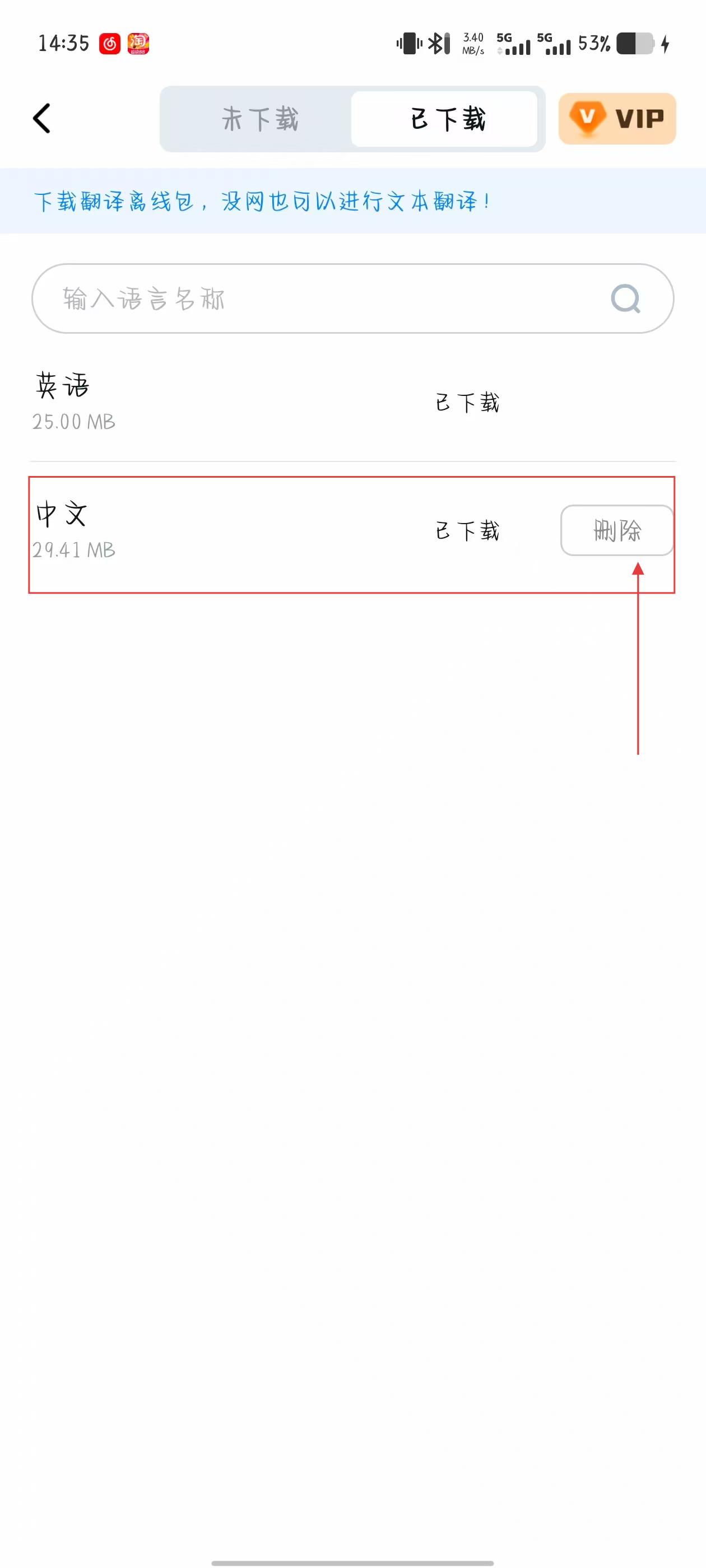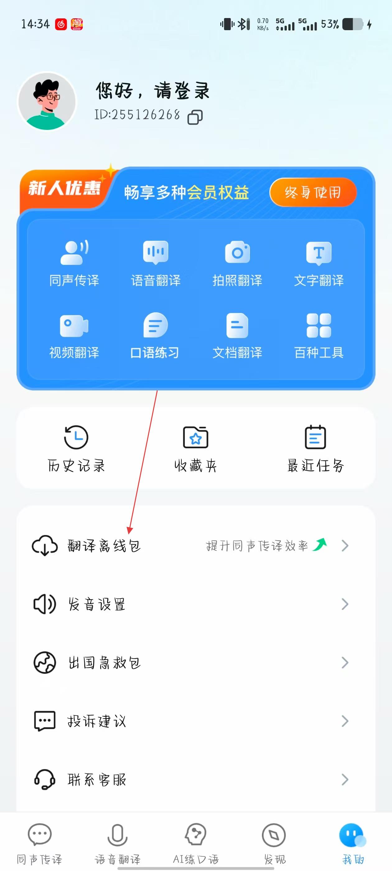 2、在個(gè)人中心頁(yè)面,找到翻譯離線包選項(xiàng)并點(diǎn)擊,進(jìn)入翻譯離線包下載頁(yè)面。