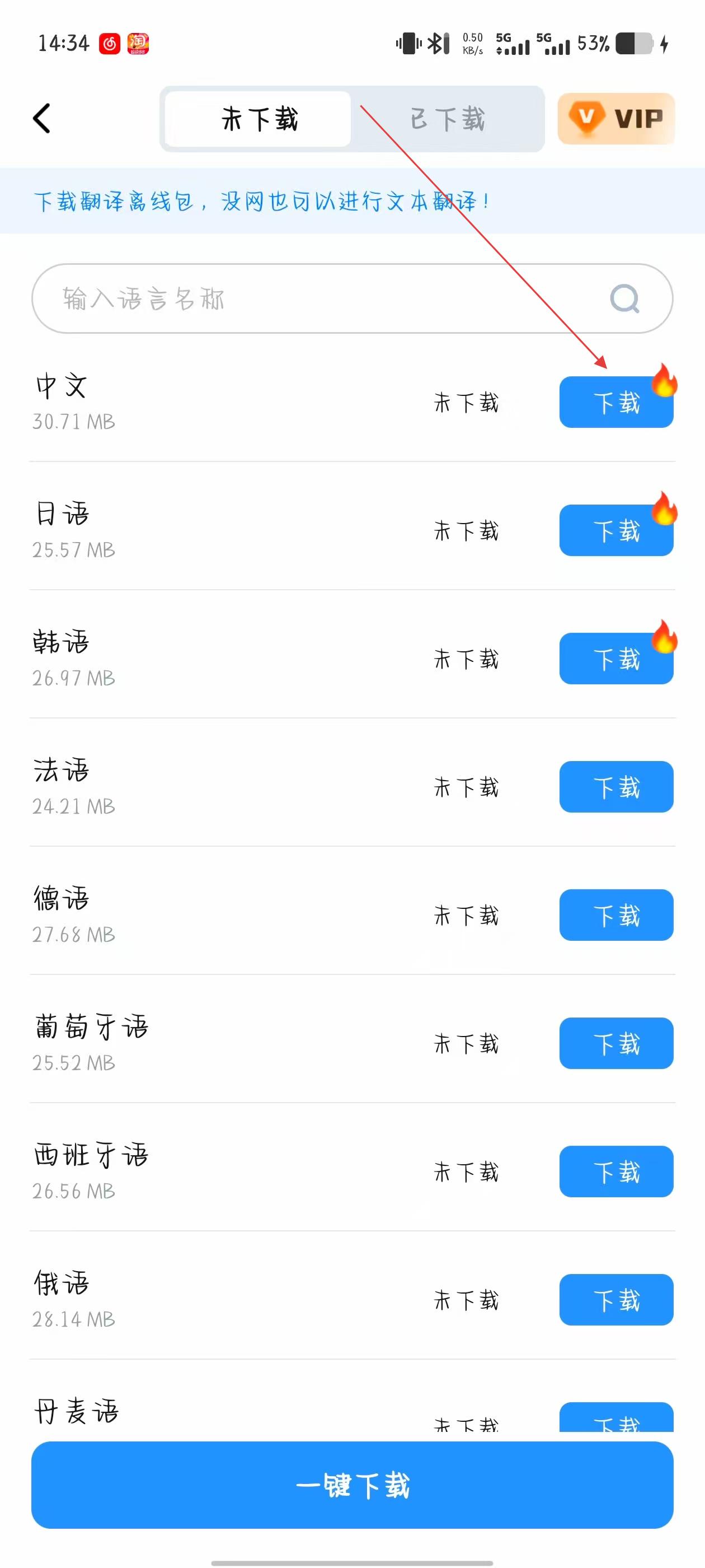 3、在翻譯離線包下載頁(yè)面,選擇需要下載的語(yǔ)言離線包,點(diǎn)擊其右側(cè)的下載按鈕。