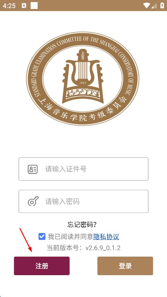1、打開上海音樂學(xué)院考級(jí)軟件,在登錄頁面點(diǎn)擊“注冊(cè)”按鈕。