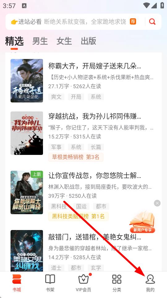 1、打開(kāi)小說(shuō)閱讀類(lèi)APP,點(diǎn)擊底部導(dǎo)航欄最右側(cè)的我的選項(xiàng)。