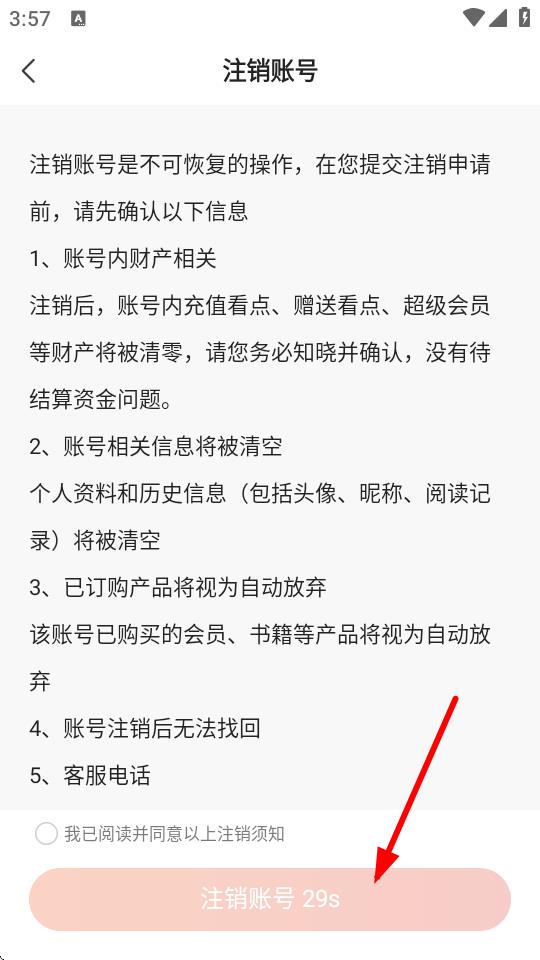 4、在注銷(xiāo)賬號(hào)頁(yè)面,仔細(xì)閱讀注銷(xiāo)須知,包括賬號(hào)內(nèi)財(cái)產(chǎn)、信息清空等內(nèi)容,確認(rèn)后點(diǎn)擊注銷(xiāo)賬號(hào)按鈕完成操作。