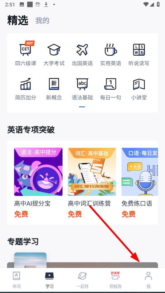 1、打開百詞斬軟件在底部導(dǎo)航欄中,點(diǎn)擊最右側(cè)的我選項(xiàng),進(jìn)入個(gè)人相關(guān)界面。
