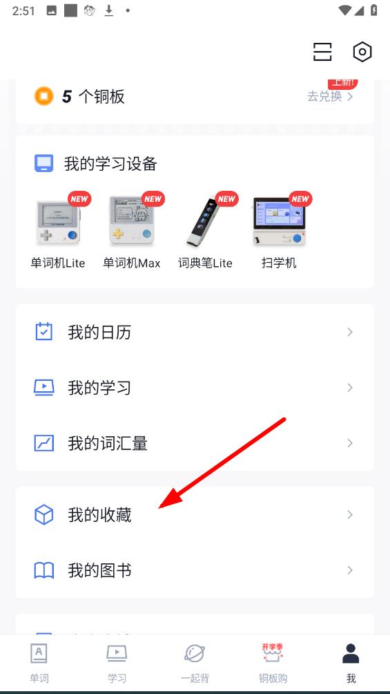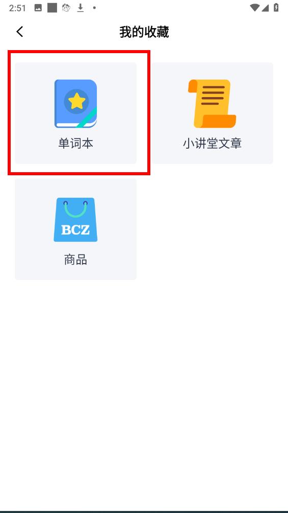 3、進(jìn)入我的收藏頁面后,會(huì)看到不同類別的收藏選項(xiàng),點(diǎn)擊單詞本圖標(biāo),就能查看你在百詞斬中收藏的單詞,方便隨時(shí)復(fù)習(xí)鞏固。