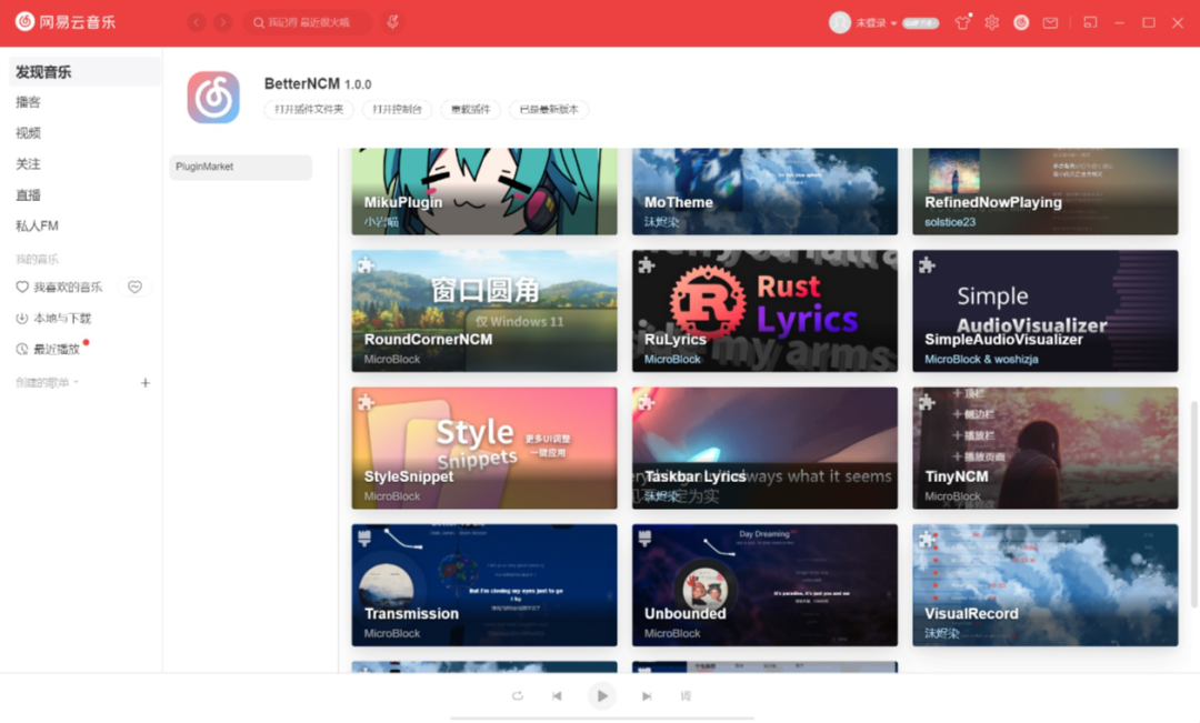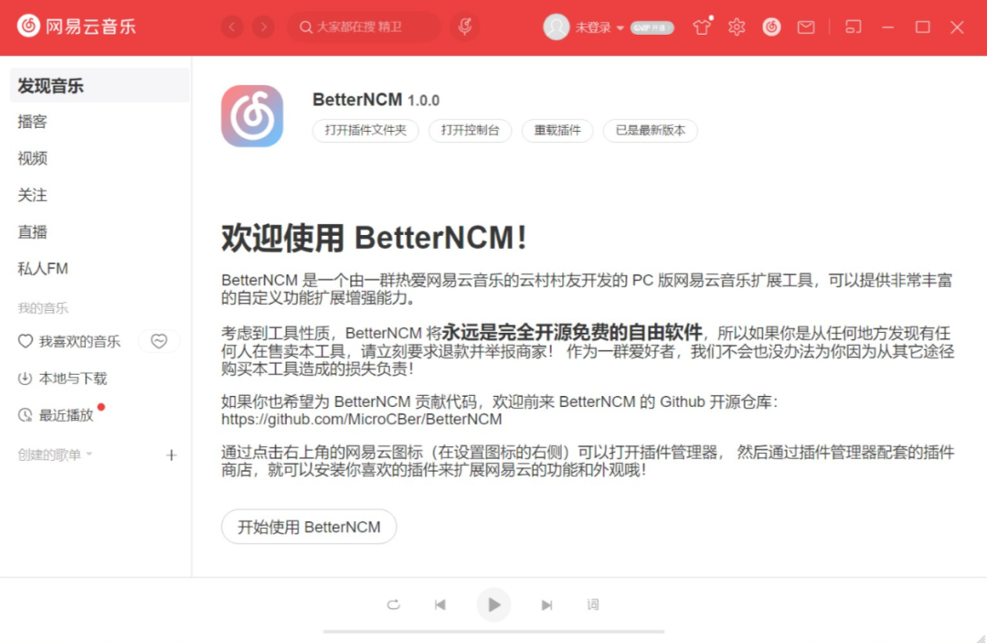 3、再次打開網(wǎng)易云音樂,安裝成功上面功能欄會(huì)多一個(gè)按鈕,點(diǎn)擊即可看見插件管理界面;