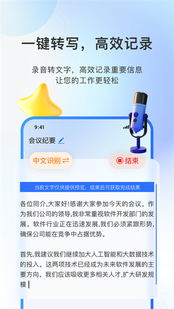 閃速錄音轉(zhuǎn)文字app是一個(gè)主要實(shí)現(xiàn)了語(yǔ)音識(shí)別、語(yǔ)音轉(zhuǎn)文字和實(shí)時(shí)語(yǔ)音翻譯的多功能應(yīng)用。本實(shí)用新型能夠根據(jù)使用者的需求滿足會(huì)議錄音和課堂錄音等日常生活各種場(chǎng)景的錄音需求,提升辦公效率。內(nèi)置高級(jí)識(shí)別系統(tǒng),讓您快速無(wú)損地將語(yǔ)音,音頻文件內(nèi)容轉(zhuǎn)換為文本輸出,并提供文字識(shí)別及多種語(yǔ)言轉(zhuǎn)換為文本翻譯,可直接組織為文檔進(jìn)行多語(yǔ)言翻譯操作。