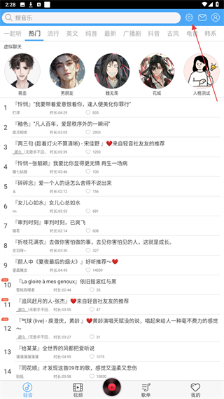 1、打開輕音社的應用APP,在首頁右上點擊齒輪狀的設置圖標。