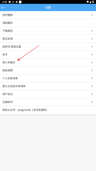2、在設置頁面中,找到青少年模式選項并點擊,進入對應功能頁面。