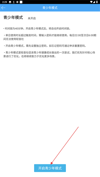 3、在青少年模式頁面,點擊頁面開啟青少年模式按鈕,完成模式開啟。