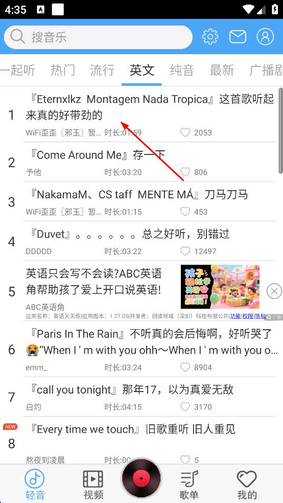 3、在英文歌曲列表頁面,瀏覽歌曲,找到想要聽的那一首,點擊該歌曲,進入歌曲播放頁面。