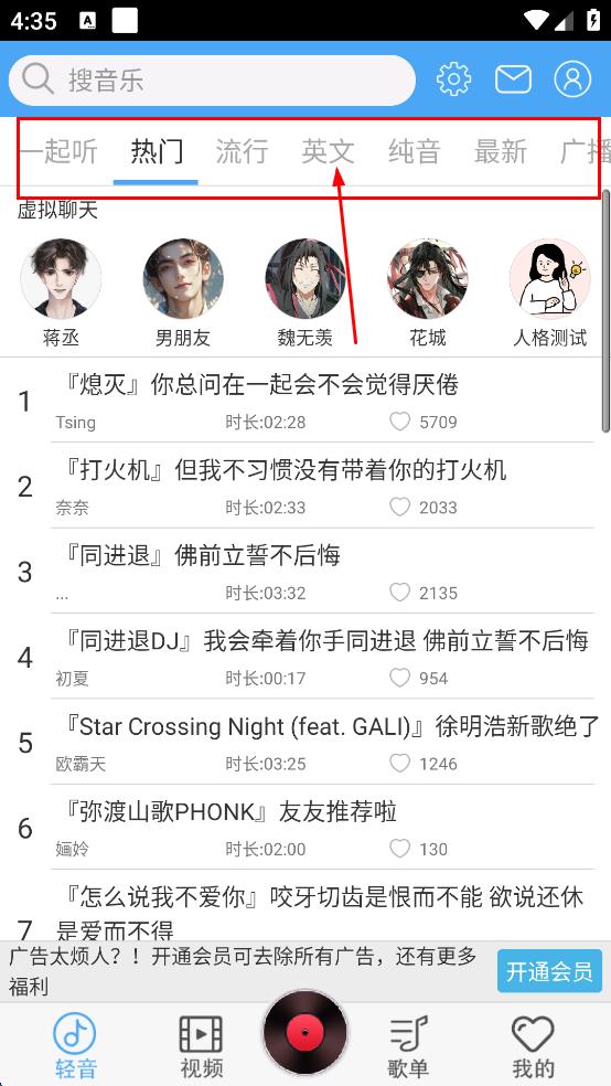 2、在主界面上方的分類欄中,找到“英文”選項,點擊它,切換到英文歌曲列表頁面。