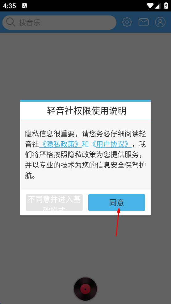 1、打開輕音社APP,會彈出權(quán)限使用說明提示框,仔細閱讀相關(guān)內(nèi)容后,點擊“同意”按鈕,進入APP主界面。