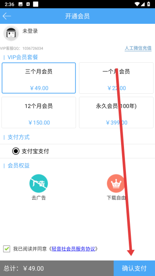 3、跳轉(zhuǎn)到開(kāi)通會(huì)員頁(yè)面,點(diǎn)擊選擇套餐后,點(diǎn)擊確認(rèn)支付按鈕進(jìn)行開(kāi)通。