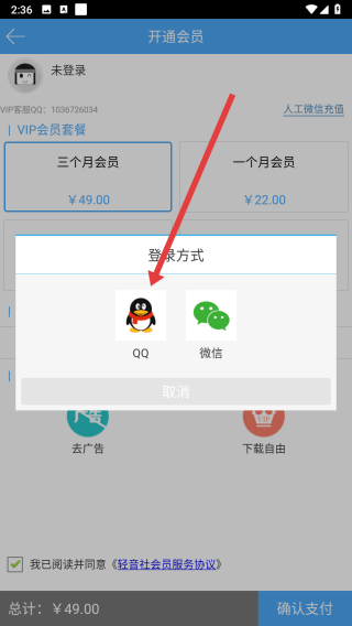 4、開(kāi)通會(huì)員需先登錄,點(diǎn)擊選擇QQ賬號(hào)登錄后即可完成開(kāi)通操作。