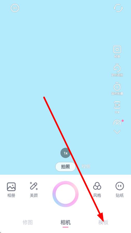 1、打開一甜相機(jī)應(yīng)用,進(jìn)入拍攝界面后,點(diǎn)擊底部的模板選項(xiàng),進(jìn)入模板選擇頁面。