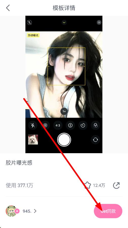 3、進(jìn)入模板詳情頁,調(diào)整拍攝角度讓人物或景物入鏡,點(diǎn)擊get同款按鈕進(jìn)行拍攝,即可拍出帶有模板效果的照片或視頻。