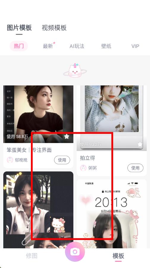 2、在模板選擇頁面,瀏覽圖片模板和視頻模板,如熱門、最新、AI玩法等分類,找到心儀的模板,比如拍立得風(fēng)格模板,點(diǎn)擊使用。