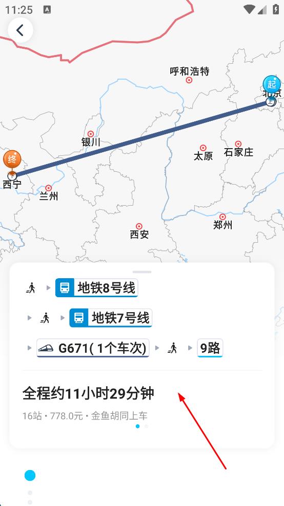 4、選定方案后,可查看詳細(xì)的出行信息,包括全程耗時約11小時29分鐘,以及涉及的地鐵線路、車次和9路公交等,方便規(guī)劃出行。