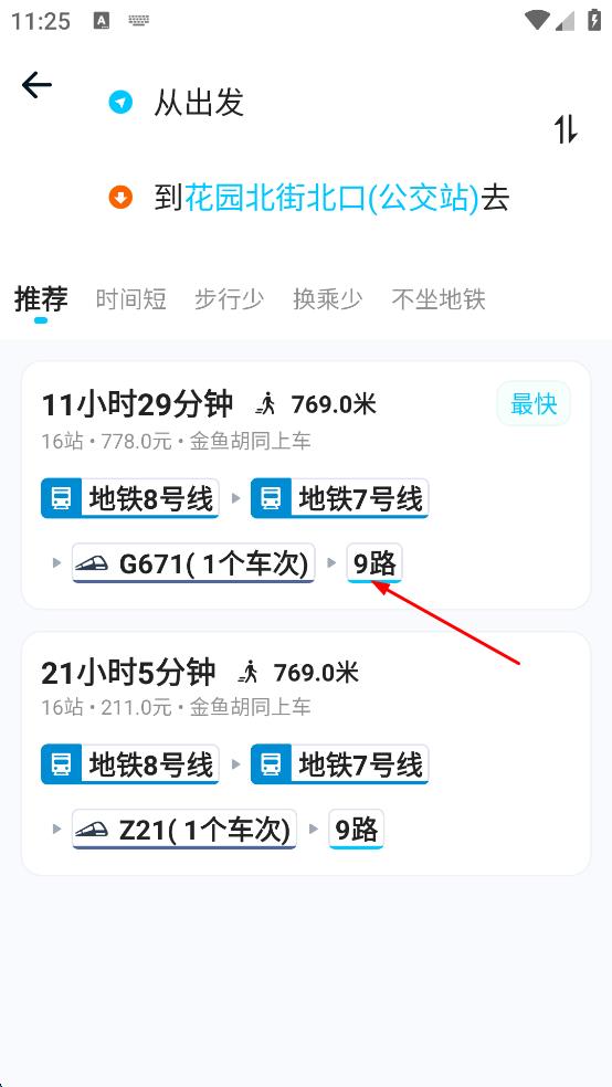 3、在線路規(guī)劃頁面,設(shè)置好出發(fā)地和目的地為花園北街北口公交站,應(yīng)用會推薦不同的出行方案,選擇其中包含9路公交的方案。