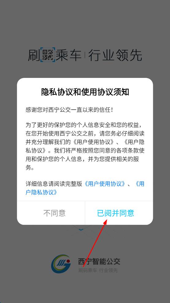 1、打開西寧智能公交,彈出隱私協(xié)議和使用協(xié)議須知,仔細(xì)閱讀后,點擊“已閱并同意”,進(jìn)入應(yīng)用主界面。