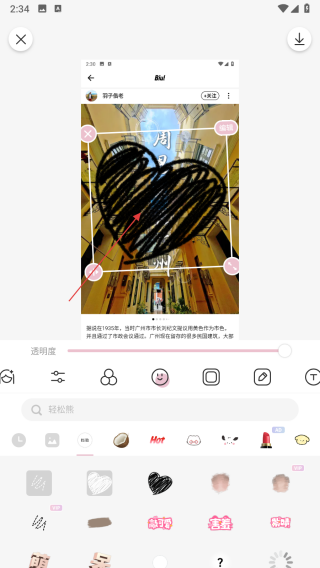 4、選中后,進入編輯頁面,點擊下方的貼紙,可拖動貼紙改變位置,或者拖動邊緣更改貼紙大小,點擊右上角可以保存。