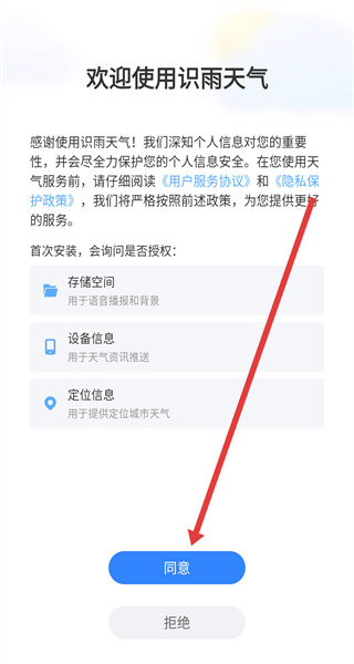 1、在識雨天氣的“用戶服務協(xié)議與隱私保護政策”彈窗點擊“同意”,進入“添加城市”頁面。