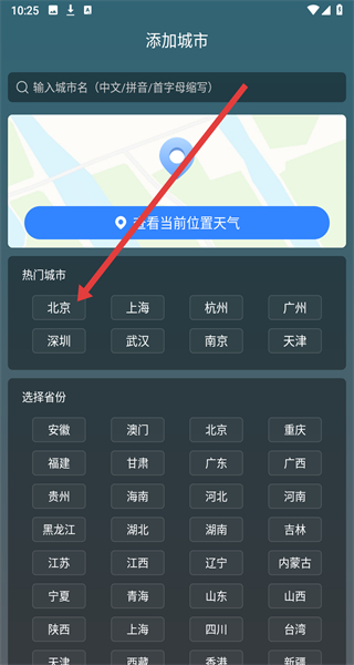 2、在“添加城市”頁面點擊熱門城市中的“北京”,進入北京市天氣頁面。