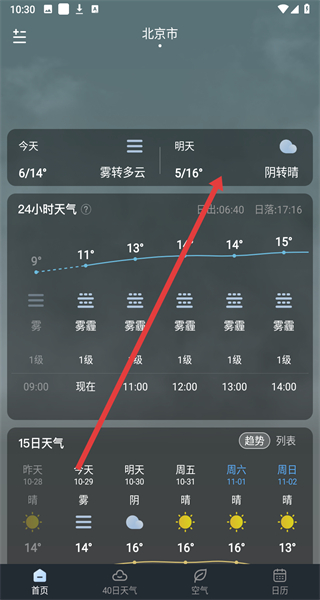 3、在北京市天氣頁面點擊“明天”天氣區(qū)域,可以查看明天的天氣情況。