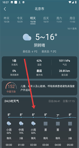 4、跳轉頁面后即可查看10月30日北京市的詳細天氣信息,包括溫度、天氣狀況、24小時天氣等信息。