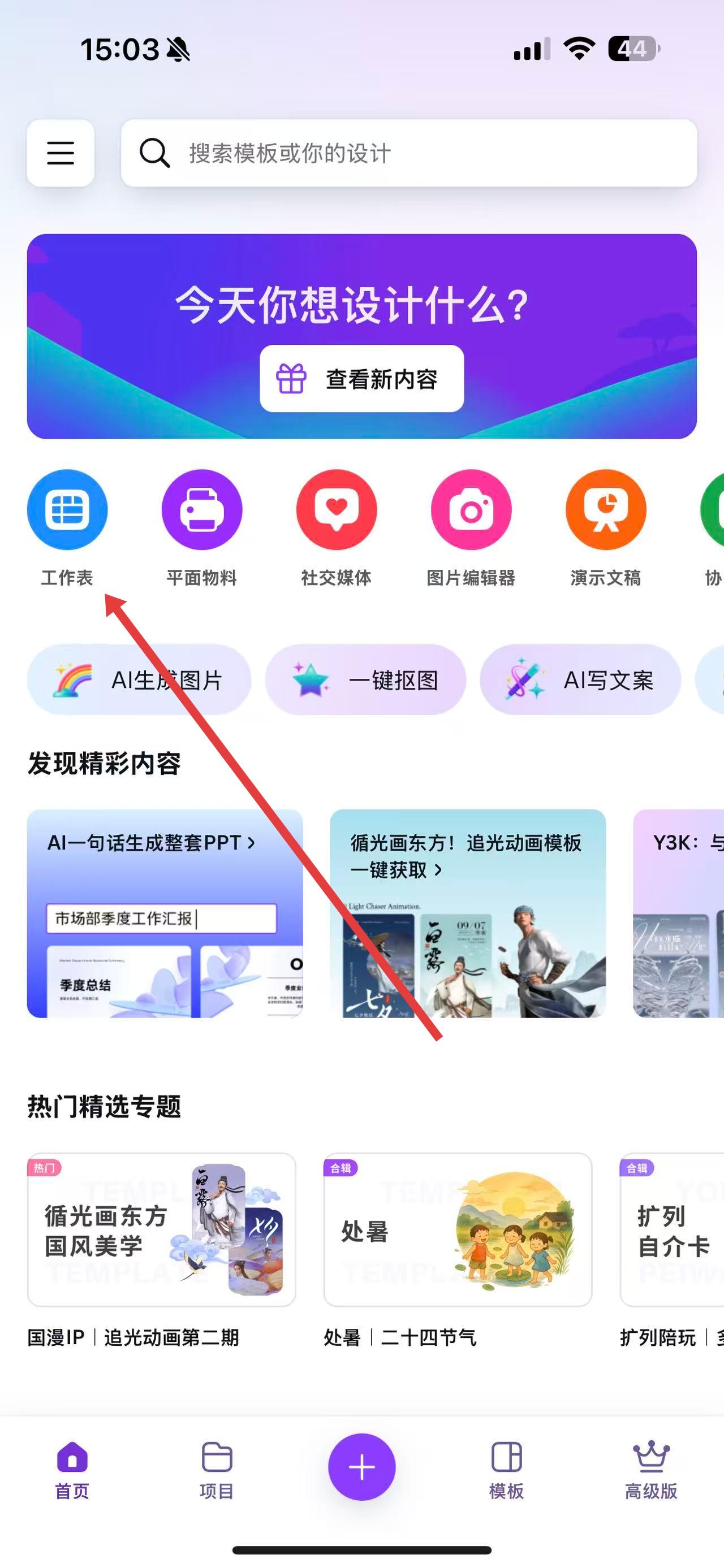 1、打開Canva可畫應(yīng)用,在首頁(yè)點(diǎn)擊工作表選項(xiàng)。