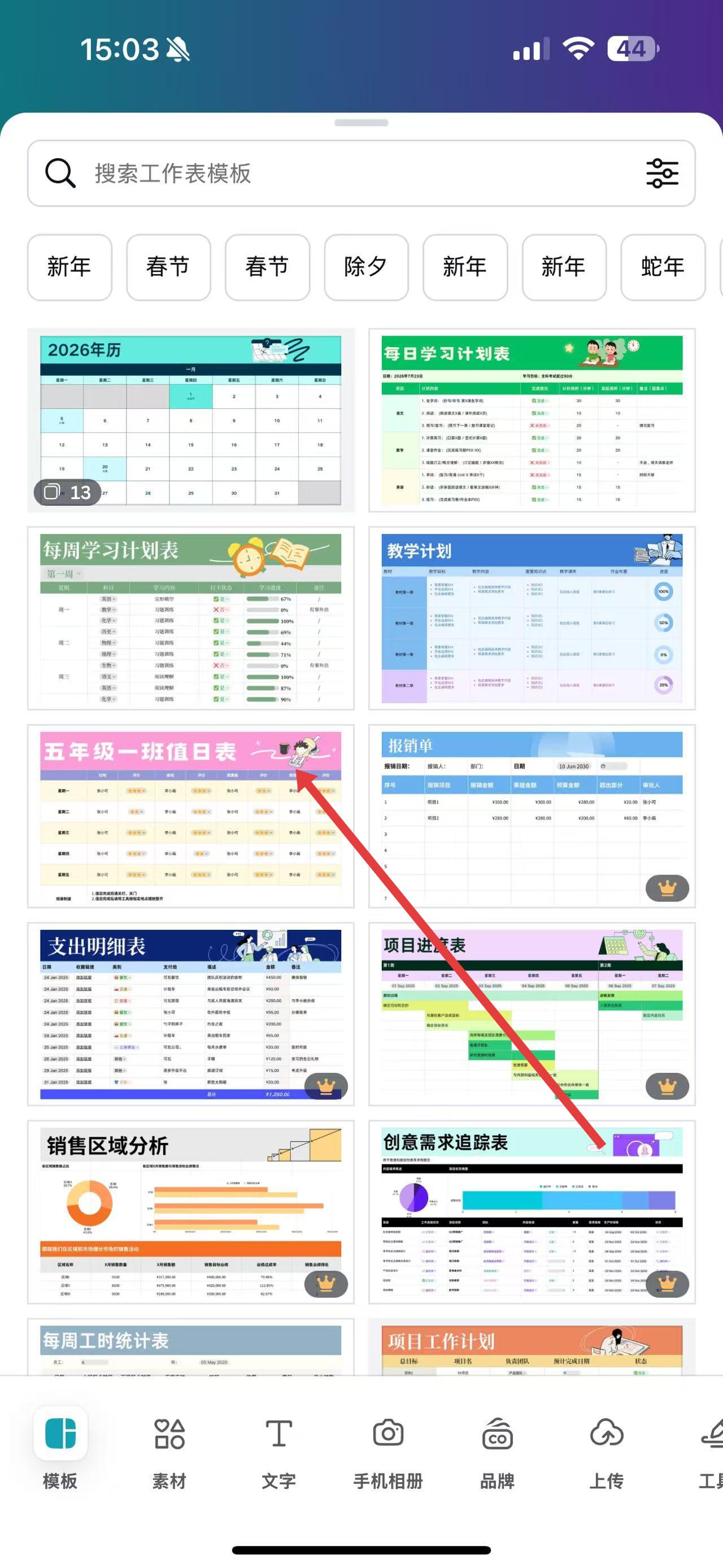 2、進(jìn)入工作表模板界面后,瀏覽并選擇你需要的表格模板,例如值日表、學(xué)習(xí)計(jì)劃表等,點(diǎn)擊所選模板進(jìn)入編輯頁(yè)面。