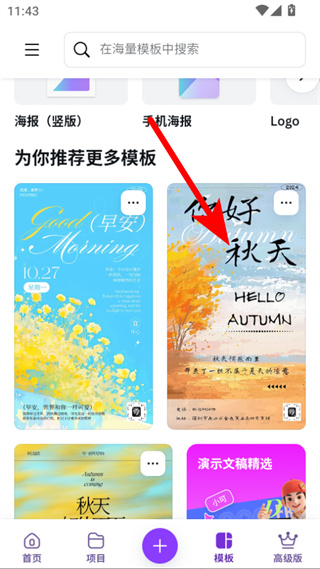2、在模板頁(yè)面中,瀏覽并選擇你想要使用的模板,如你好秋天模板。