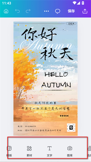 3、進(jìn)入模板編輯頁(yè)面后,可點(diǎn)擊底部的素材、文字、圖庫(kù)等選項(xiàng),添加或修改元素。