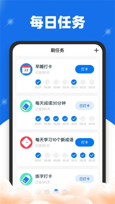 2、每天可以進(jìn)行自己制定不同的計劃,可以實(shí)時的進(jìn)行打卡,避免自己忘記處理。
