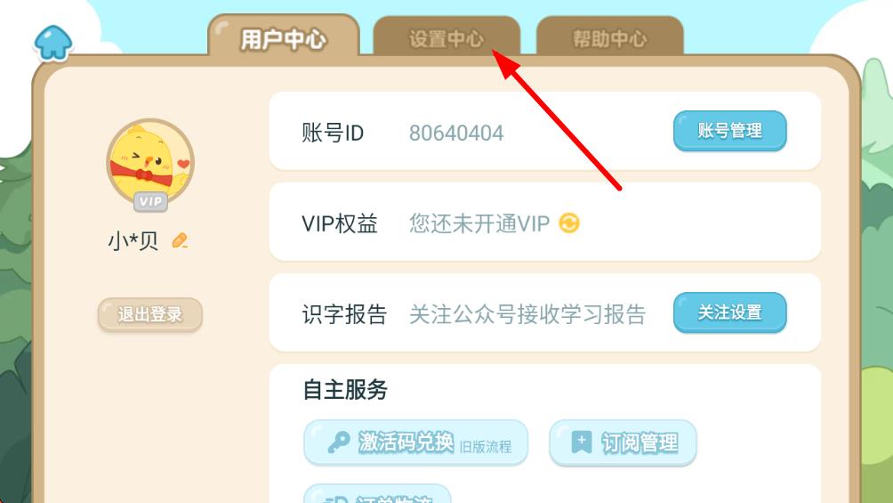 2、在家長(zhǎng)中心里,點(diǎn)擊上方的設(shè)置中心選項(xiàng),進(jìn)入設(shè)置相關(guān)界面。