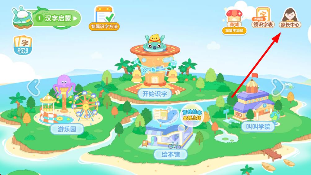 1、打開(kāi)叫叫識(shí)字應(yīng)用,在主界面點(diǎn)擊右上角家長(zhǎng)中心圖標(biāo),進(jìn)入相關(guān)操作頁(yè)面。