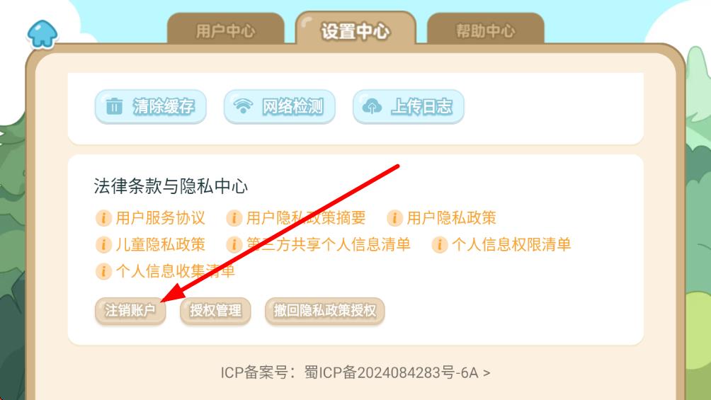 3、在設(shè)置中心頁(yè)面,下滑找到法律條款與隱私中心板塊,點(diǎn)擊注銷賬戶按鈕,按照后續(xù)提示完成賬號(hào)注銷操作。