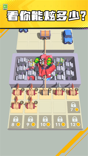 汽車大亂斗是一款汽車主題的游戲,玩家需要在游戲中使用掛鉤拉動汽車,銷毀掉這些汽車,看看自己的究竟能銷毀多少量汽車,不同的掛鉤的能力也是不同的,看看自己的掛鉤能掛上多少。