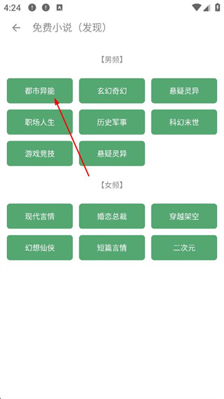 3、在免費(fèi)小說分類界面點(diǎn)擊“都市異能”分類。