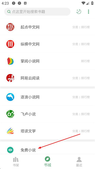 2、進(jìn)入書城界面后點(diǎn)擊“免費(fèi)小說”選項(xiàng)。