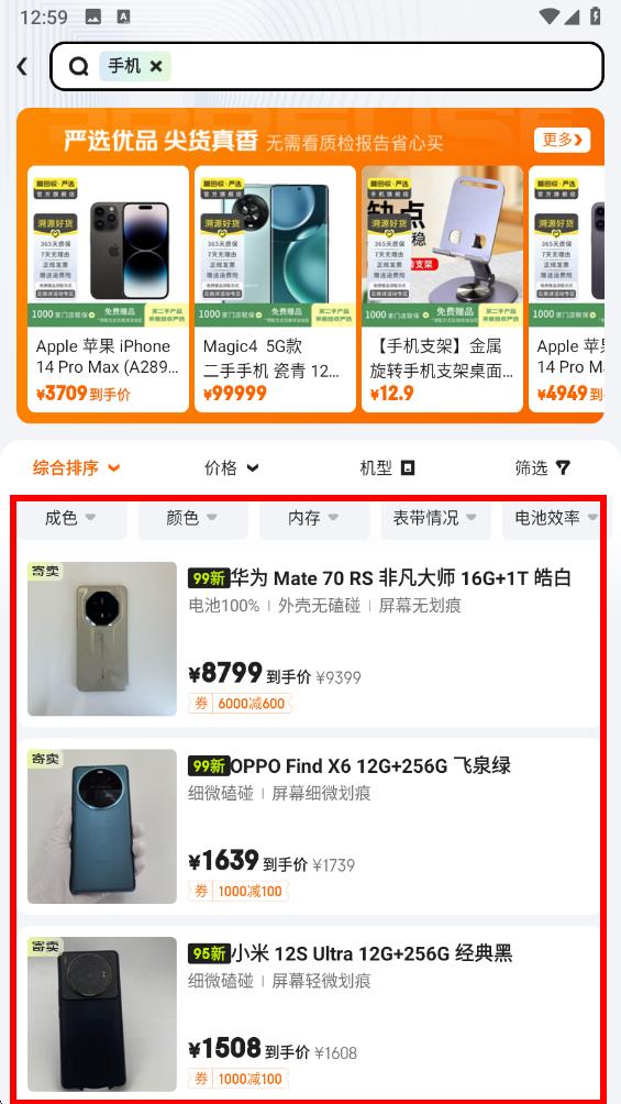 2、比如手機(jī),點(diǎn)擊搜索后瀏覽搜索結(jié)果,找到想要購買的目標(biāo)商品。