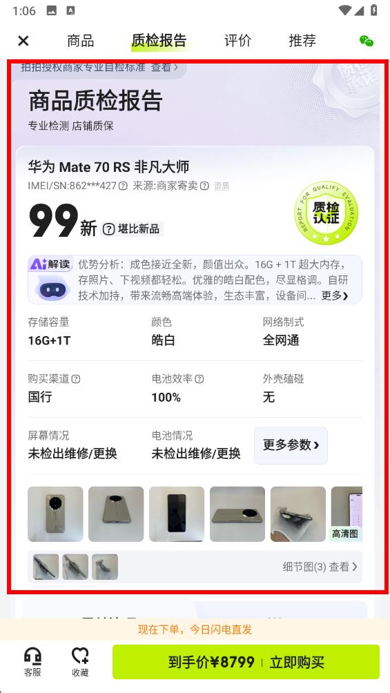 3、進(jìn)入后下滑即可查看該商品詳細(xì)的質(zhì)檢信息,包括成色、存儲容量、網(wǎng)絡(luò)制式等參數(shù)-還能查看商品的細(xì)節(jié)高清圖片。