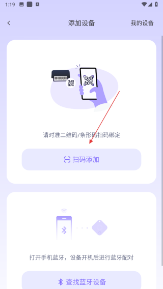 3、進入添加設備頁面后,點擊掃碼添加按鈕。