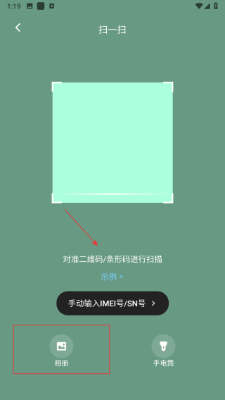 4、進入掃一掃界面,可直接對準設備的二維碼/條形碼進行掃描,也可點擊相冊按鈕,從手機相冊中選擇包含設備二維碼/條形碼的圖片。