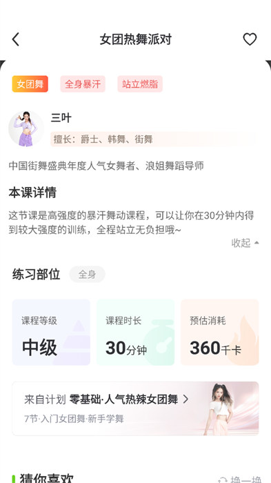 3、點(diǎn)擊自己想要練習(xí)的課程可以清晰的了解到課程所消耗的熱量和部位等。