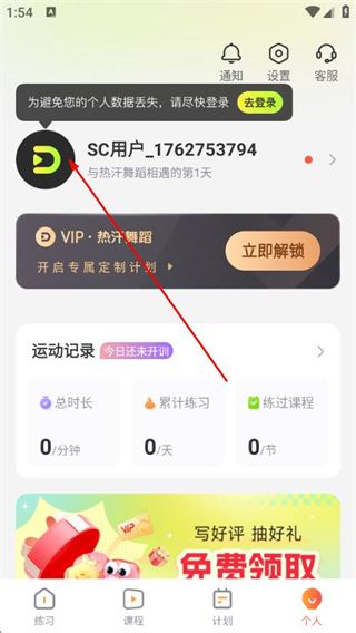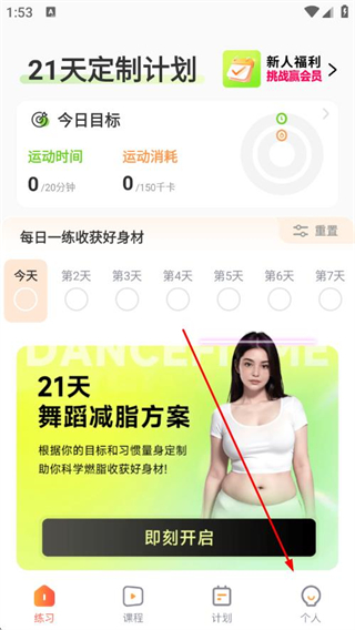 1、打開(kāi)熱汗舞蹈APP,點(diǎn)擊底部個(gè)人進(jìn)入個(gè)人中心頁(yè)面。