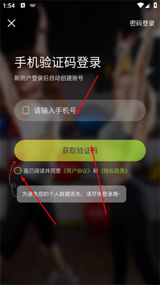 3、在登錄界面選擇手機(jī)驗(yàn)證碼登錄,輸入手機(jī)號(hào),勾選協(xié)議,點(diǎn)擊獲取驗(yàn)證碼。