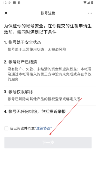 4、進(jìn)入賬號注銷頁面后,查看并確認(rèn)賬號滿足注銷條件,勾選我已閱讀并同意注銷協(xié)議,然后點(diǎn)擊下一步。