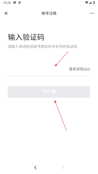 5、在輸入驗(yàn)證碼頁面,輸入賬號綁定手機(jī)號收到的驗(yàn)證碼,點(diǎn)擊下一步即可注銷。