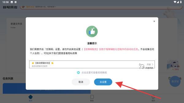2、彈出溫馨提示窗口,點擊去設置按鈕,找到自動按鍵點擊相關選項并開啟權限。