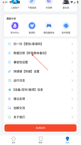 2、在我的頁面,點擊數據遷移所有腳本備份選項。